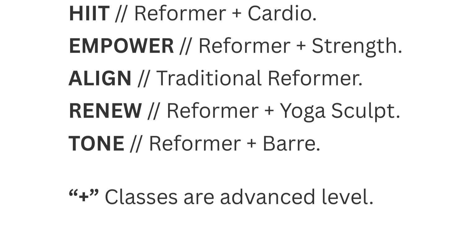 Our custom Reformers were designed by founder, Courtney Miller to maximize flow, efficiency and safety in a class with the added ability to seamlessly incorporate fusion modalities like Yoga, Barre, and fitness without losing the traditional Pilates Reformer repertoire.